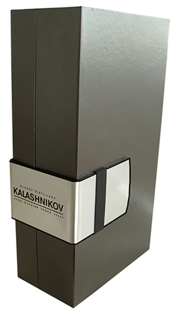 Внутри коробки располагаются ложементы для крепления составляющих подарочного набора: карандаш, ручка, блокнот, коробка с магнитным конструктором, бутылка водки Kalashnikov Unique.